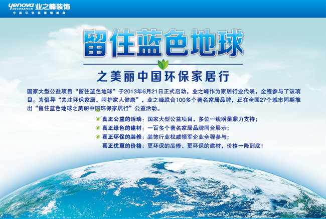 作为全国环保家居的领跑者,业之峰一直倡导“关注环保家居、呵护家人健康”,注重家居环保的同时,更注重环保理念的推广。由高晓松亲自执导,由陈数、张子健、马德华、爱戴等明星出演公益微电影《地球来信了》及由小柯作词作曲、著名歌星那英和小柯合唱公益歌曲MV《留住蓝色地球》就是由业之峰全程赞助的,希望能借此契机,让更多的人参与到环保事业中,让我们用绿色的心灵留住蓝色的地球。