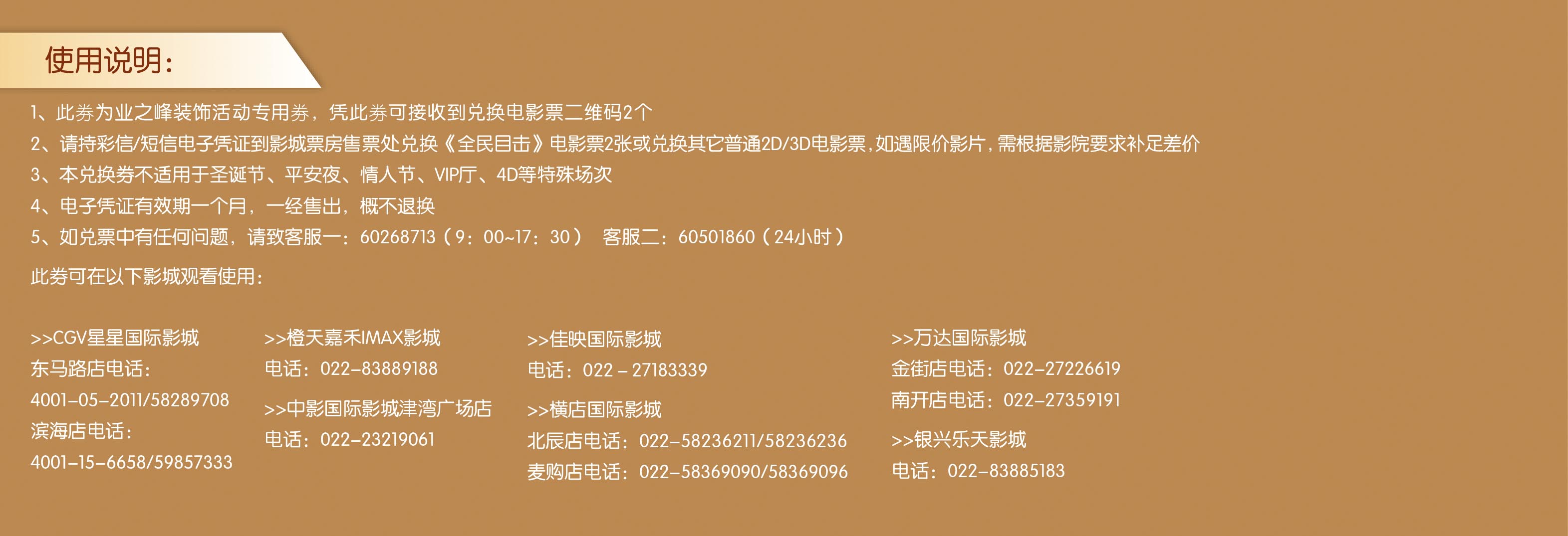 为了能让客户朋友们能更好地了解“全环保家装体系”,天津业之峰将携手金地紫云庭、振业城中央和路劲太阳城三个小区,于2013年9月14日下午14:00在河东区世纪豪泰酒店开展“全环保家装体系”河东专场活动。届时,客户朋友们将能全面的了解“全环保家装体系”,同时,为了回馈广大客户朋友们,天津业之峰也将有好礼送出!前十五位到场的客户将能领取由天津业之峰提供的《全民目击》电影兑换券。机不可失,时不再来!大家赶快来踊跃参加吧!