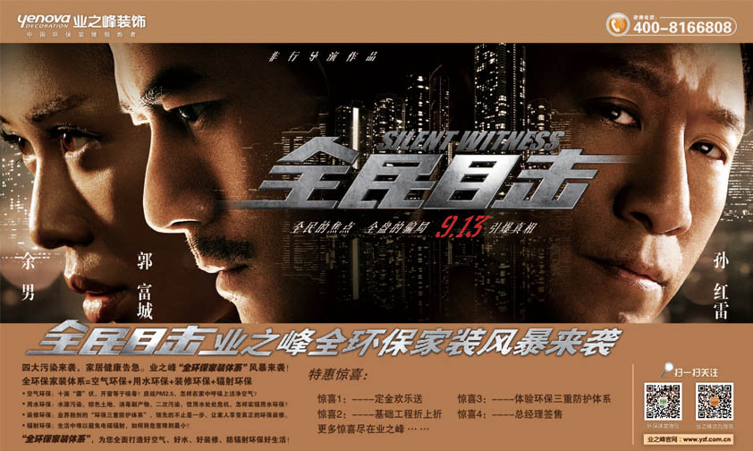 由郭富城、孙红雷两大影帝联袂主演的电影《全民目击》即将于9月13日上映,业之峰装饰作为该电影中国地区装修类合作伙伴,与之携手展开一系列的宣传推广活动。业之峰也借此机会为广大消费者带来一场全方位的环保家装盛宴。