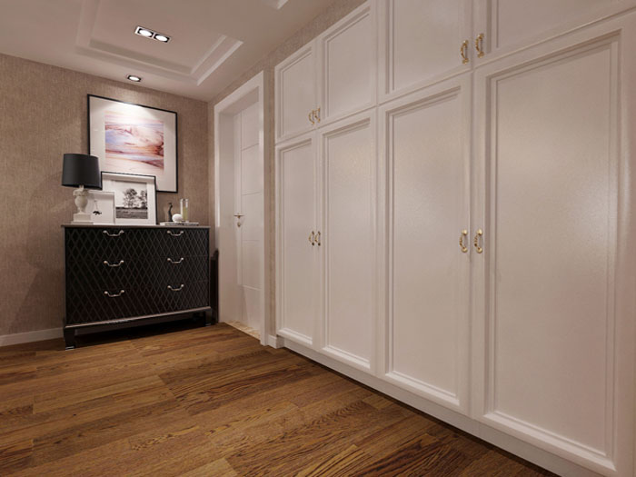 入户空间是一个缓冲过渡地段,虽然是居室空间中比较狭小的一角,却对整个居室空间的风格起着至关重要的作用。本案将入户处从简,放置玄关柜作为修饰,简单大方,入户柜子与主卧门相呼应,形成一个整体。