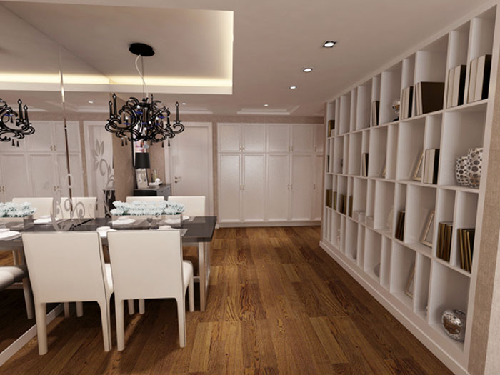 餐厅的环境设计重要的就是就餐环境的营造。实际风格要与整个居室风格一致协调。本案餐厅的亮点就是采用镜子,营造出现代风格的特色。同时也与客厅和卧室背景墙相呼应,都采用镜子做修饰。