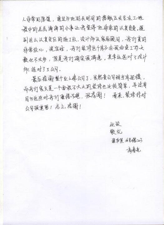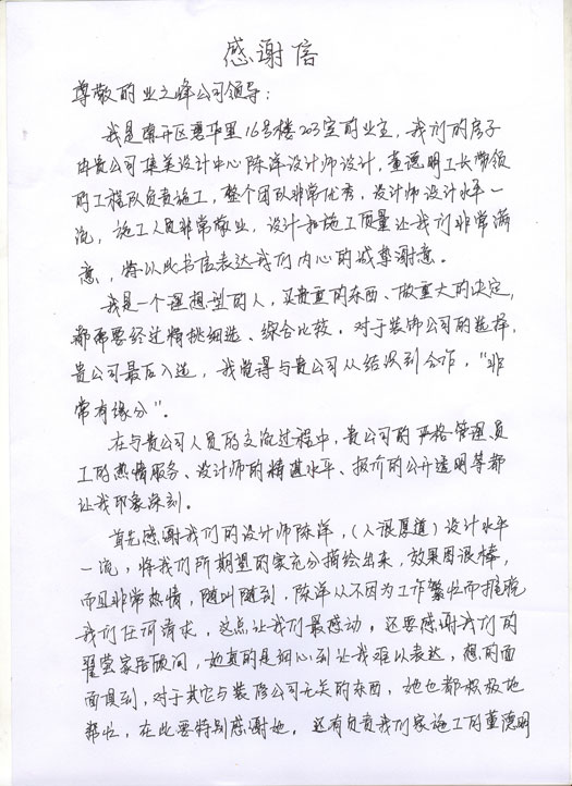 我是南开区碧华里16-203的业主,我们的房子由贵公司集美设计中心陈洋设计师设计,董德明工长带领的工程队负责施工,整个团队非常优秀,设计师水平一流,施工人员非常敬业,设计和施工质量让我们非常满意,特以此书信表达我们内心的诚挚谢意。